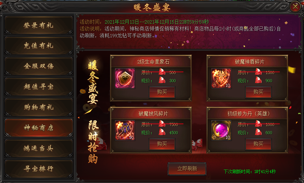 活动说明:活动期间,神秘商店倾情促销稀有材料!商店物品每2小时自动刷新(或全商品全部已购后),消耗199龙钻可手动刷新。