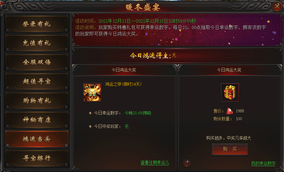 活动说明:玩家每消耗1988龙钻即可获得一个1-100之间的幸运数字。每日21点抽取今日幸运数字,拥有该数字的玩家即可获得今日鸿运大奖。