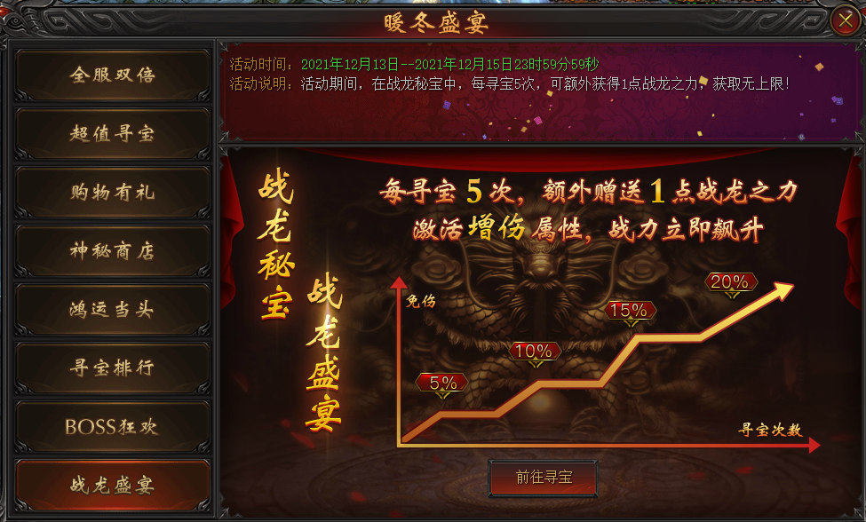 活动说明:活动期间,在战龙秘宝中,每寻宝5次,可额外获得1点战龙之力,获取无上限!
