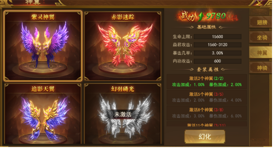3、激活更多的神翼可以获得属性加成,并可随意幻化
