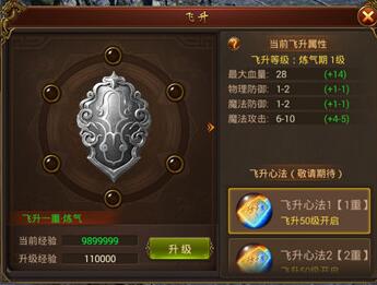 炼气期1级:最大血量:28,物理防御:1-2,魔法防御:1-2,魔法攻击:6-10,升到下一级所需经验:110000;