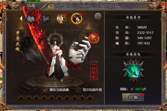 3、激活战魂可获得大量属性以及强力buff:攻击时有概率释放“断魂斩”,对当前目标施加1.5秒的“断魂”效果:断魂状态下,目标及其分身无法释放任意技能且无法移动,同时受到的一切伤害提升15%,激活后永久生效