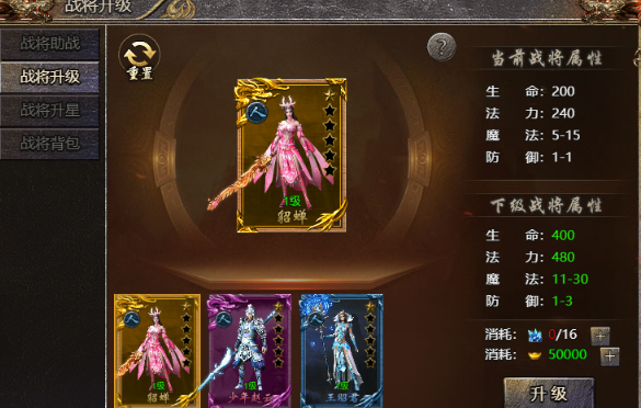战将由一个主将和四个副将组成。主将继承100%的属性,而四个副将各继承25%的属性。完整的战将不可分解,但多余的碎片可以分解。