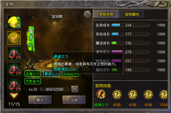 宠物技能:宠物每达到20、40、60、80、100级可解锁一个宠物技能。与天赋系统不同,宠物技能均为百分比加成,种类包括阵法玉佩、装备、经验加成等属性。