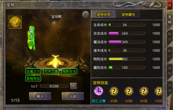 技能解锁:宠物每20、40、60、80、100级会开启一个技能,已解锁的技能可提取到背包中。