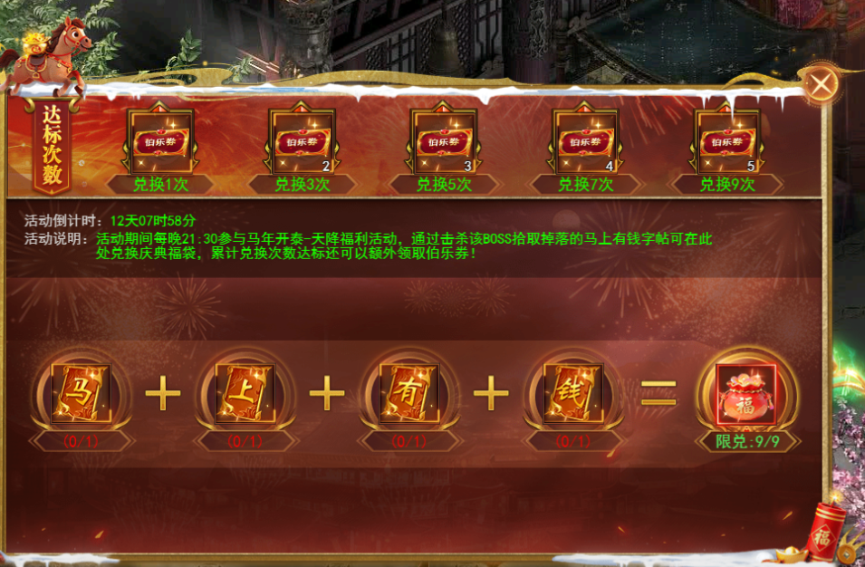 参与庆典送礼祝福抽奖,幸运玩家可额外获得稀有称号“瑞马迎春”!