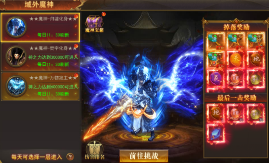 每日11:30魔神降临域外,每层BOSS独立计算奖励,玩家可选其中一层参与(每日仅可选一层进入,前往挑战后无法更改);