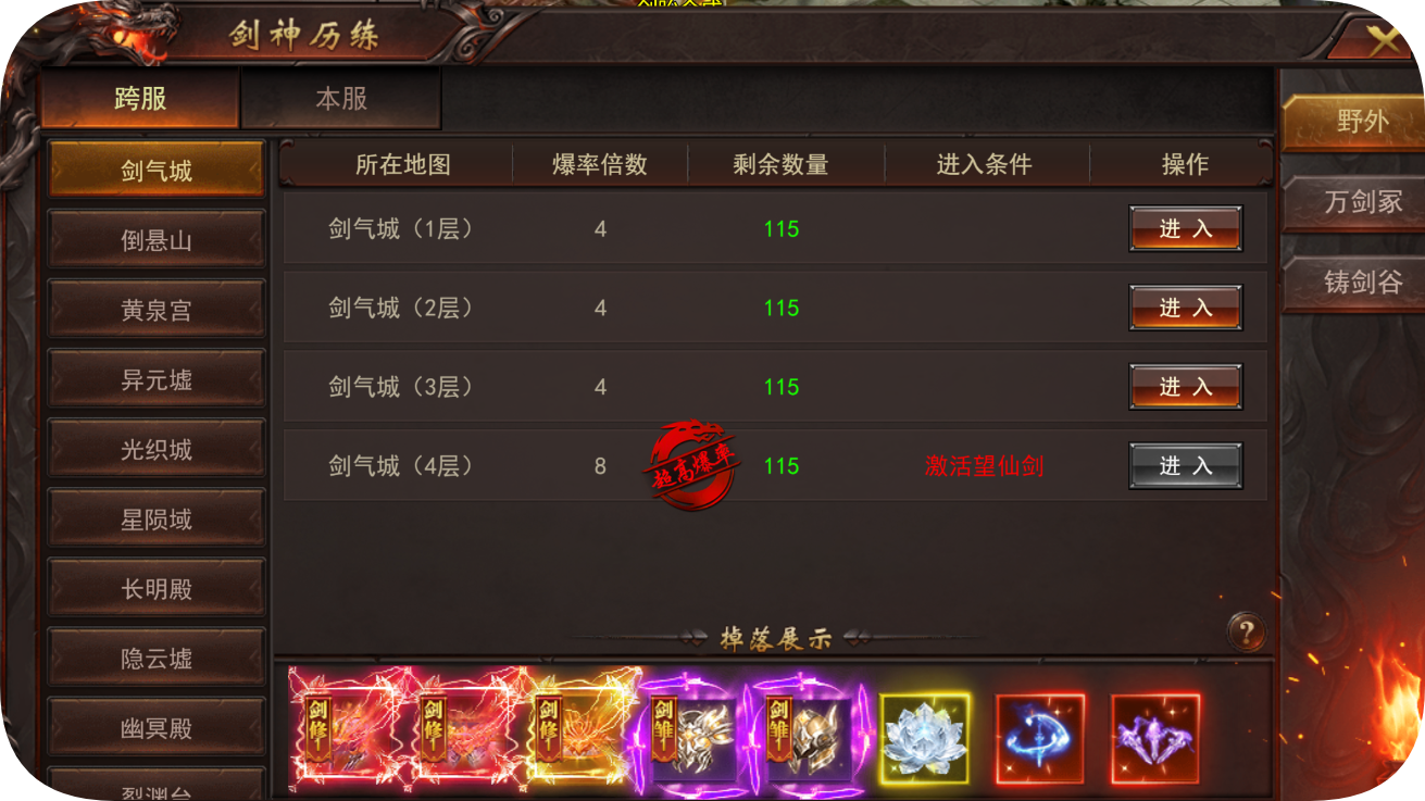 -剑神历练:该地图分为本服和跨服地图;每层的场景进入所需的剑修等级和上古神剑不