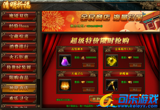 1.活动期间,玩家可在神秘商店中购买商品,商品可用金币,绑元,元宝进行购买;