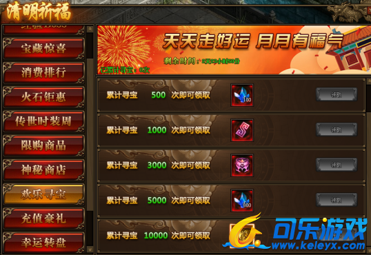 1.活动期间,玩家累计寻宝次数满足要求,可以领取本职业星石、高级仙装、仙装灵器等相应奖励;