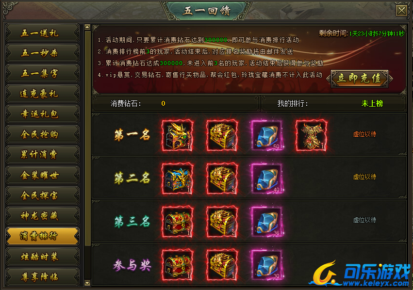 活动说明:活动期间,累计消费达到300000钻石的玩家参与排行,排名前三的玩家可获得珍贵装备、稀有道具等奖励,奖励在活动结束后以邮件的方式进行发放