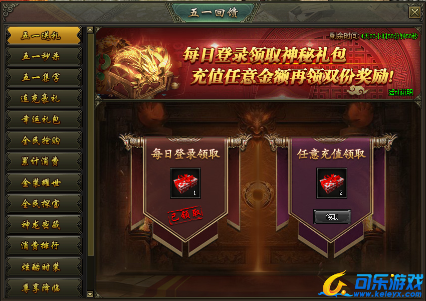 活动说明:活动期间,每天登录即可领取登录礼包,充值任意金额可再领取双份奖励