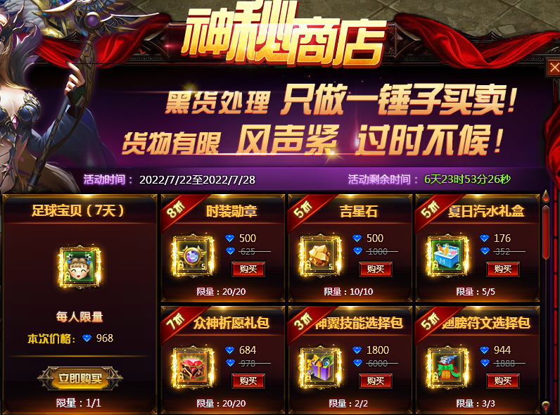 活动内容:神秘商品限时折扣,货物稀有,难得一见,快来选购吧。