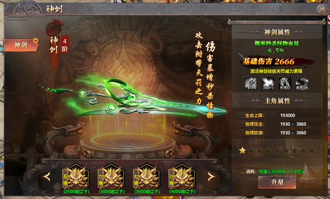 2、提升神剑可对更高等级怪物造成压制,提升玩家杀怪效率。