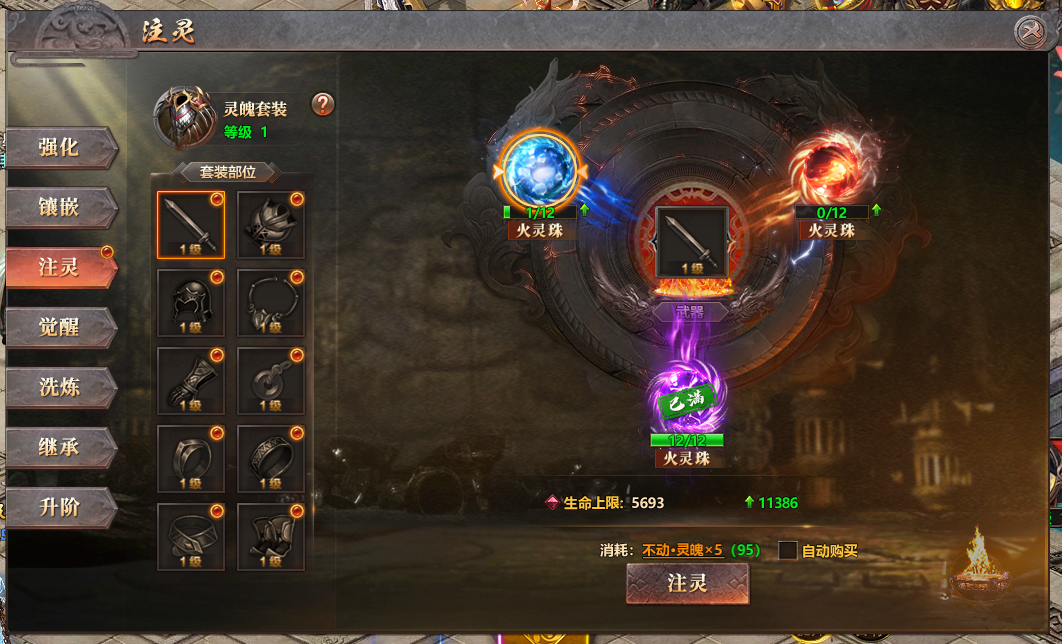 3、装备注灵:每件装备上携带有多种不同的灵魄,消耗灵魄可进行装备注灵,提升装备部位的属性。