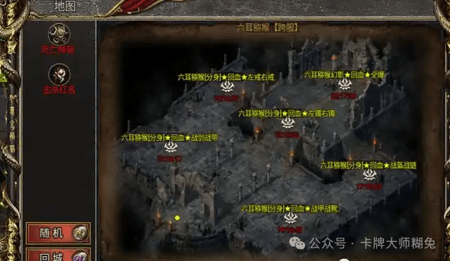 六耳猕猴是混沌领域里的新地图,六耳猕猴地图分为本服和跨服,每一层都有六只boss,分别是左戒右戒,左镯右镯,战甲战靴,战盔战链,战剑战带,以及全爆。