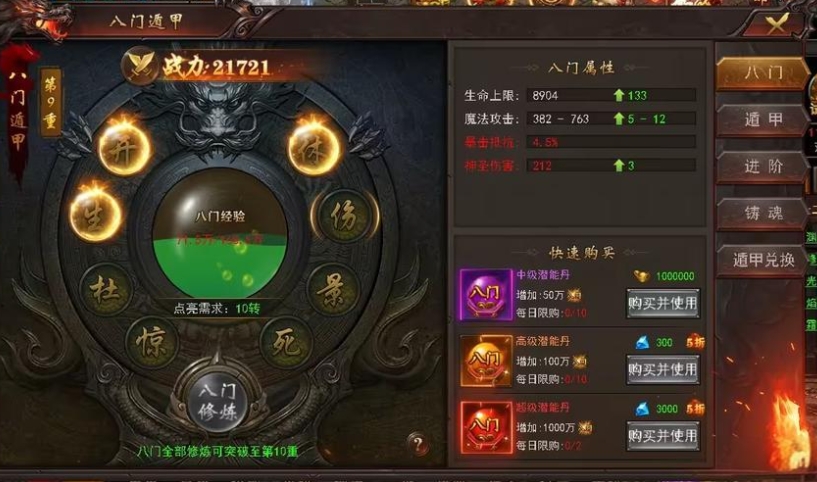快速购买:玩家可以使用快速购买功能来增加经验值,快速提升八门等级。