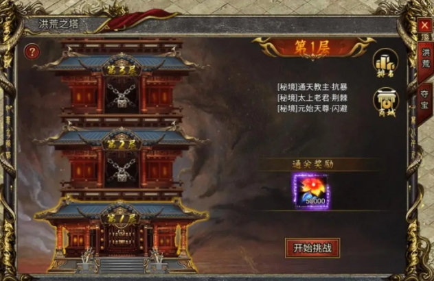 洪荒之塔是单人挑战玩法,玩家需要在3分钟内击败本层的3只BOSS,成功通关即可获得奖励。该玩法有以下要点:
