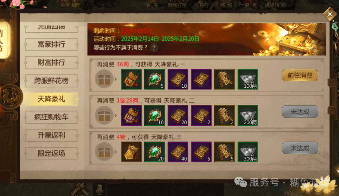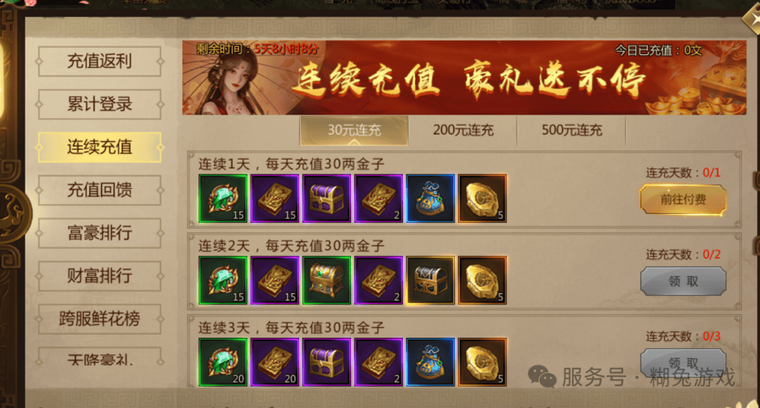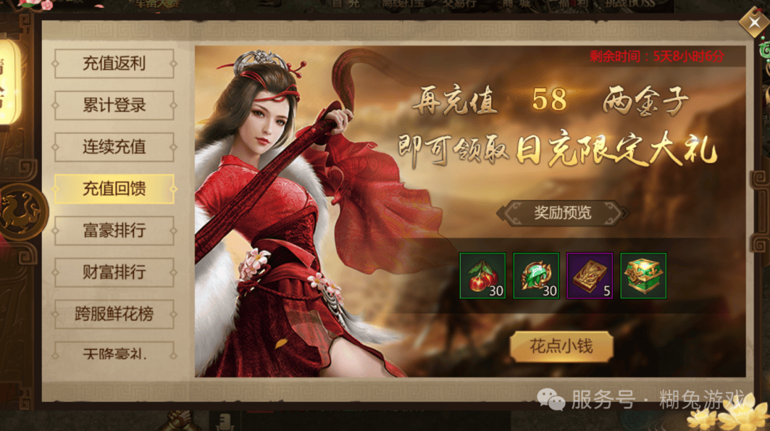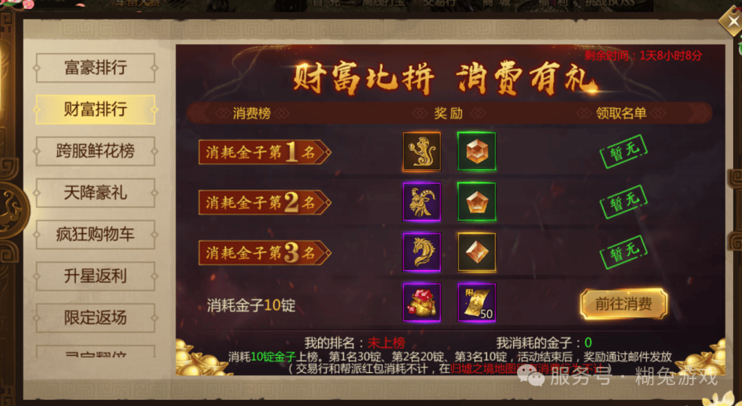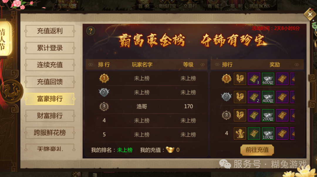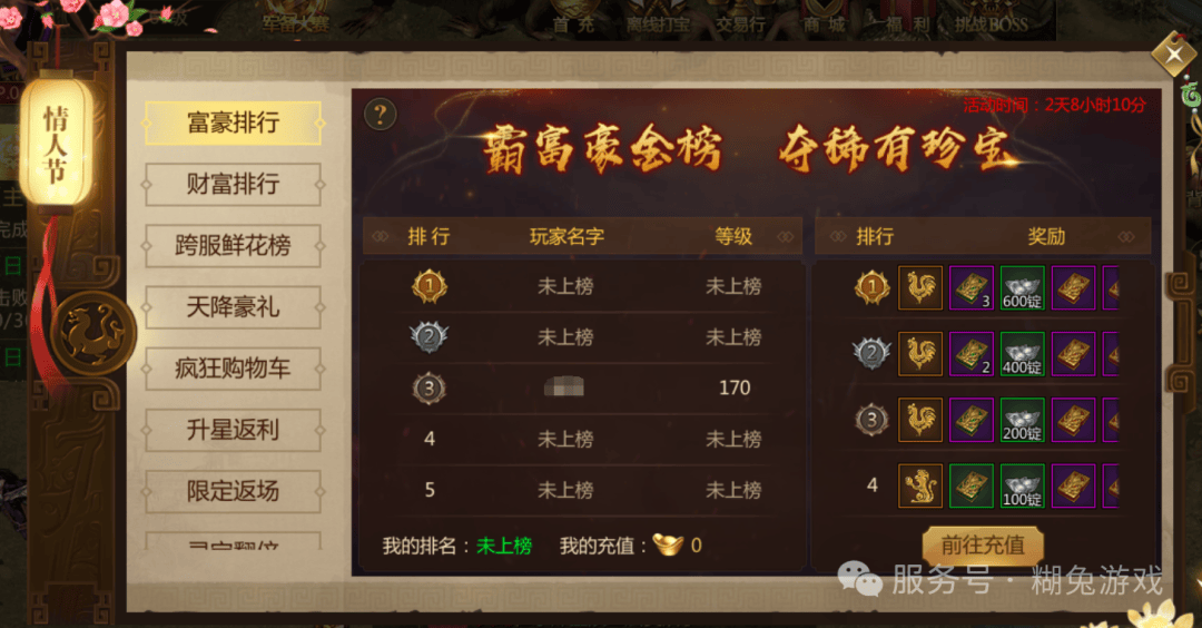 充值满30锭金子即可参与。第4-6名50锭金子上榜: