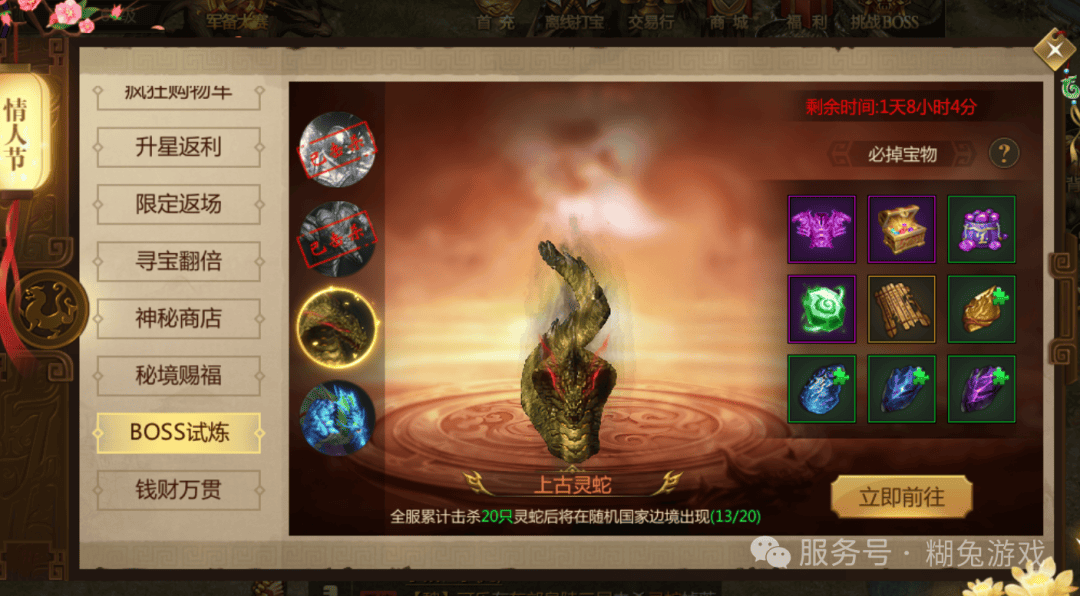 击杀指定BOSS达到一定数量后一定时间可召唤出上古BOSS;上古BOSS被召唤时间为10点至23:30之间上古BOSS归属方式为首刀归属,归属者被击杀后归属将会转移至击杀者。