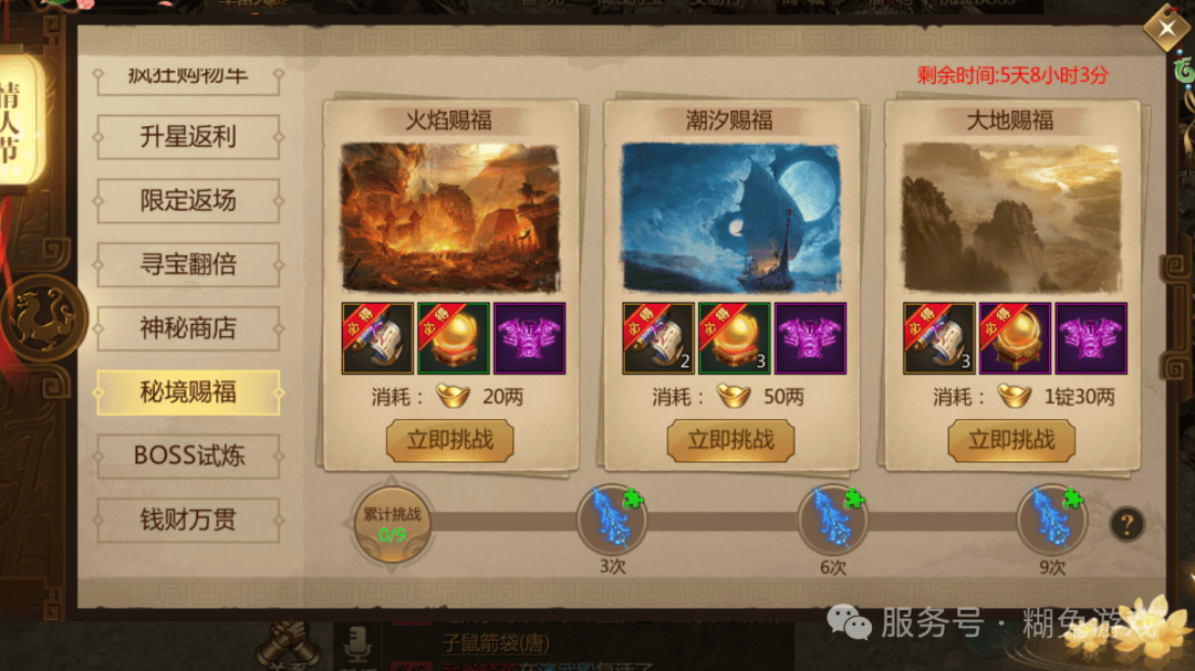 任意秘境每天都只能付费进入一次赐福秘境需要当天充值过才能进入;赐福秘境有概率掉落高级生肖装备;多次挑战赐福秘境可以获得累计通关奖励;