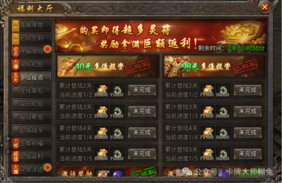 新区投资:激活新区的40米和98米投资礼包后,每天可以领取灵符。