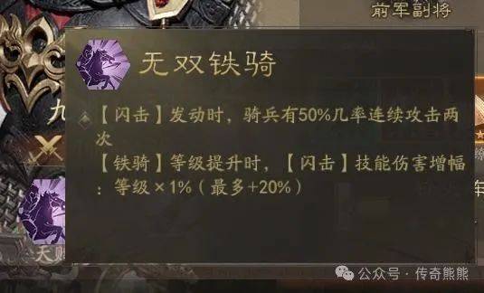 觉醒技能2:若武力达到110,骑兵每回合都能发动一次奇袭,且伤害+50%