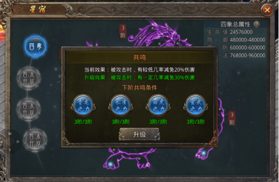 集齐青龙、朱雀、白虎、玄武四大圣兽后,玩家将获得四象共鸣套装效果。当角色被攻击时,有一定概率减免百分比伤害,且随着星宿等级的提升,减免的伤害比例也会相应提高。这不仅提升了角色的生存能力,还增强了团队整体的战斗力。