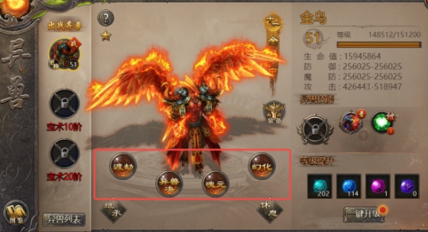 机制:异兽每5级可进行一次渡劫,成功后将进化为更高阶的异兽并提升等级上限。即使渡劫失败,也会返还部分材料。