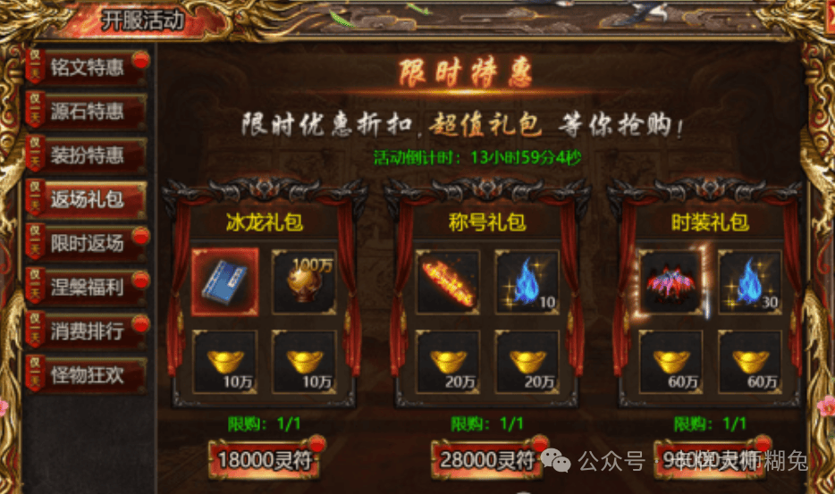 返场礼包•冰龙、异火礼包:限时返场,特别是对于想开小号或者平民玩家来说,异火礼包是非常划算的选择,不容错过。