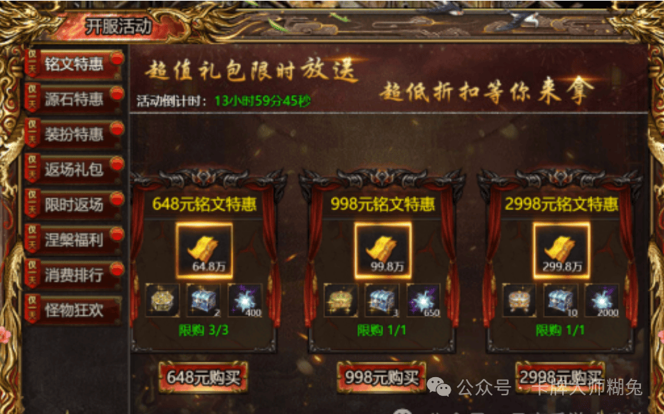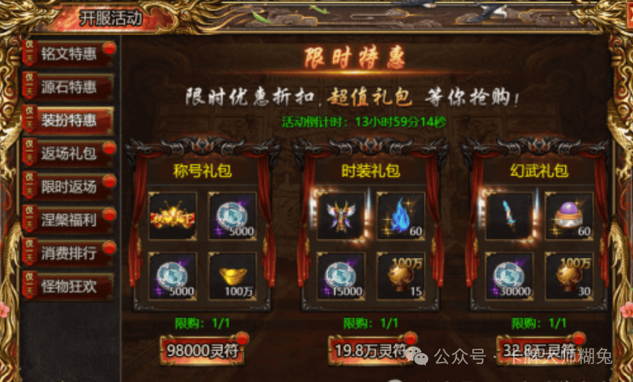 铭文特惠•源石和铭文礼包:推荐全部购买,因为这类活动一个月仅一次。 •源石特惠:8万灵符可购买一个源石,限购99个。源石是提升装备的重要材料,建议优先考虑。