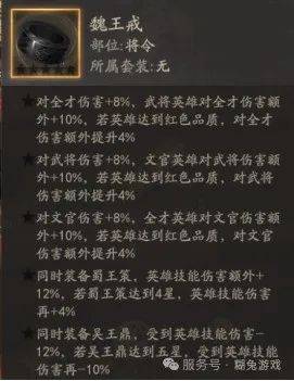 魏王戒 特点:在帅印没有出之前可以一直使用,提供前后军伤害加成和免伤加成。