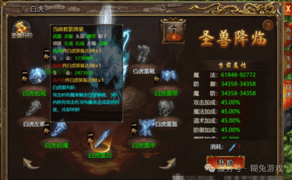 白虎套装是朱雀套装之后的第三个圣兽套,需要开区达到120天且必须要穿戴全朱雀1阶套装才能解锁,白虎套装的属性比较不错。