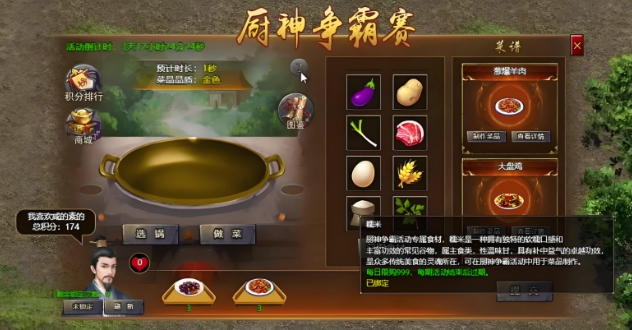 厨神争霸是《原始传奇》中的一项限时活动,玩家通过烹饪不同的菜肴,提交给评委,提升好感度,最终根据排行榜获得丰厚奖励。排行榜的奖励包括减少技能伤害3%的时装,这对于法师等职业效果极佳。因此,掌握厨神争霸的玩法,不仅能提升你的战力,还能让你在游戏中获得稀有装备。
