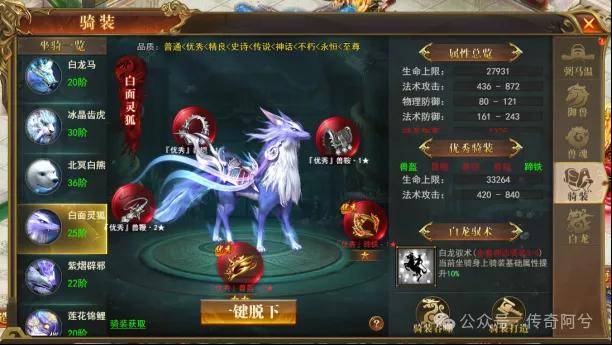 玩家在开启灵山大陆后,可以通过“御兽-骑装”入口进入骑装系统。骑装分为五个关键部位:**兽盔、兽鞭、兽铠、兽鞍和蹄铁**。每个坐骑都有对应的骑装穿戴条件,越强大的坐骑,其对骑装的品质和等级要求越高。因此,玩家需要不断提升自己的骑装,才能驾驭更强大的坐骑,从而在战斗中获得更大的优势。