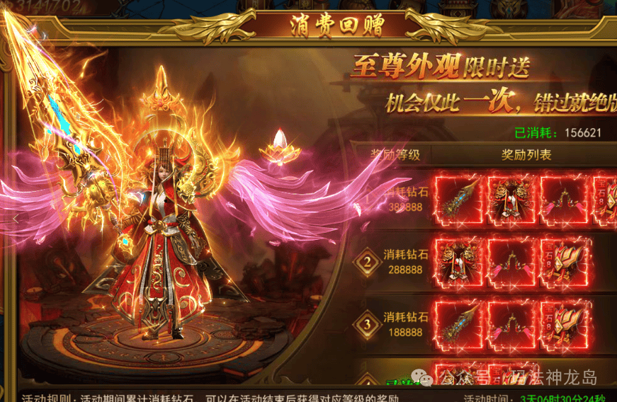 游戏在固定的开服天数之后会有对应的消费回馈活动。玩家通过消费钻石,达到对应的等级奖励,最高可以同时获取天帝的战刃和战袍以及莲羽幻羽。