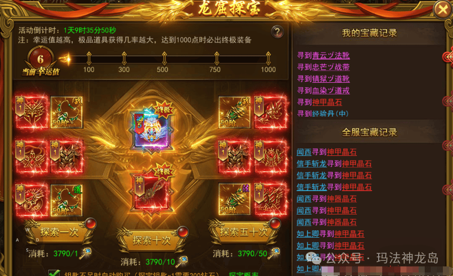 龙窟探宝以使用钻石抽取装备,该活动没有上限,可以持续积累幸运值。