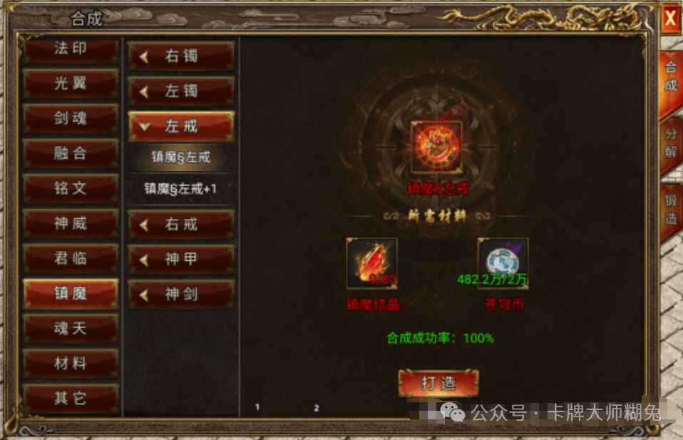 此外,镇魔装备的获取途径主要是通过合成,具体步骤如下: