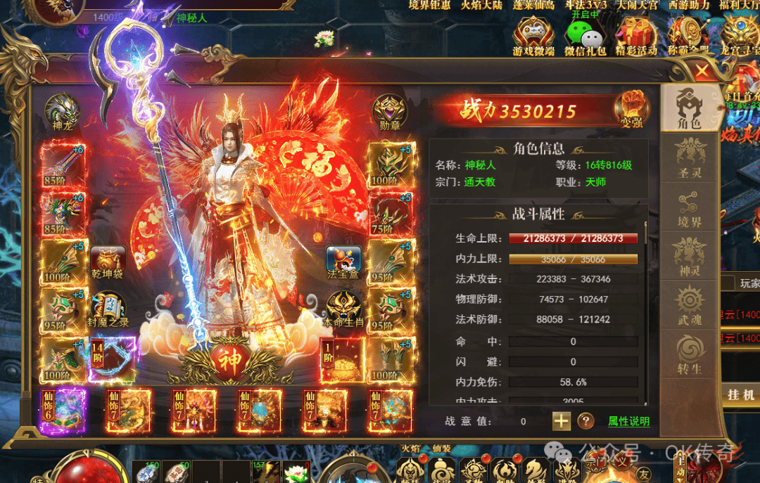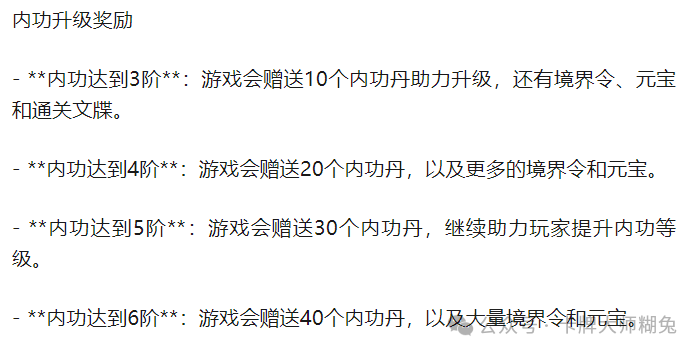 当内功的总等级达到最高14阶时,游戏会赠送顶级神装【大圣】圣带,提供防御和攻击加成,以及大量境界令、元宝和技能书页。