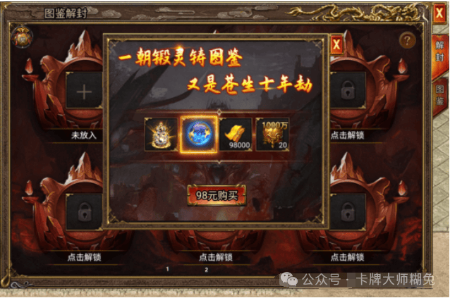 初始状态默认只有一个炉子。98元宝解锁一个额外的炉子,并获得一个上古魔胎。总共可以解锁5个炉子,解锁后可以立即获得5个上古魔胎,用于孵化5个魔级图鉴。