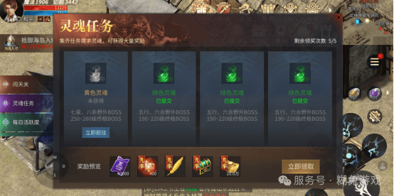在任务界面提交所需颜色的灵魂,完成任务并领取奖励。优先积累绿色灵魂,因为它们更容易获取且在灵魂任务中经常被要求。