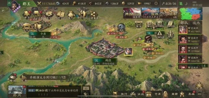 步兵兵营:甘宁作为重兵种输出将领,优先提升步兵兵营等级、兵营科技,以及观星台中的刀光、盾击、扩阵等选项,这些都能显著提升步兵和将领的攻击、防御和兵种数量。