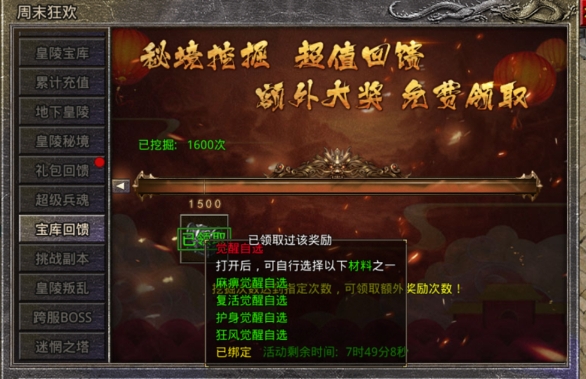 特戒觉醒功能在开服90天后解锁。玩家需要在皇陵秘境中单日挖宝达到1500次,即可领取特戒觉醒自选箱。这个自选箱是激活特戒觉醒效果的关键道具,使用后可以选择一种特戒的觉醒效果。
