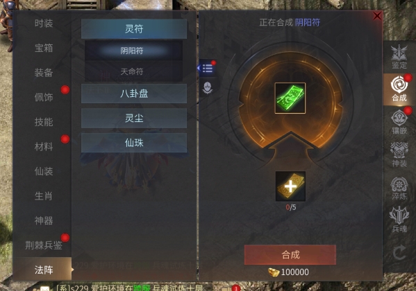 合成升级:点击地图下方的“≡”图标,打开锻造界面,选择“合成”,再选择需要升级的法阵装备。