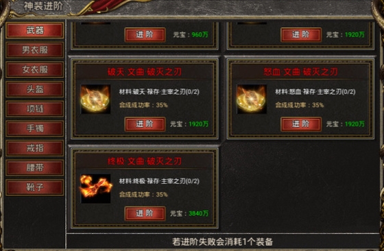 技巧:先通过进阶或融合的方式,合出9转终极或12转终极装备,然后再按照上述路径,通过进阶的方法逐步合成更高级的装备。这是最节省元宝的方式。