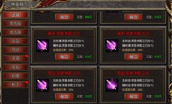 吸血属性:只有武器、项链和玉佩带有吸血属性,但玉佩不在进阶融合的范畴内,它可以在合成神饰中进行升级。由于带有吸血属性的武器和项链在游戏中的爆率极低,所以在融合装备时,一定要将带吸血属性的装备作为主材,其他属性的装备作为辅材,这样即使融合失败,带有吸血属性的主材也能保留下来。