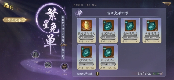 购买次数:限时免单商店一天最多只能购买30次,因此需要花费元宝增加购买次数。一次购买30次机会需要花费450元宝(100+150+200)。如果不着急,可以选择分三天购买,最后一天仍需购买1次额外机会(100元宝)。
