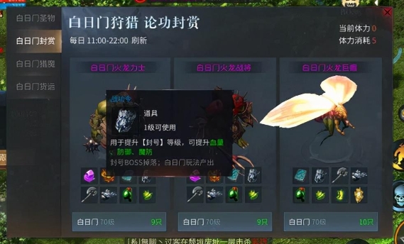 白日门猎魔:白日门猎魔任务的BOSS爆率较高,但有数量限制。如果被其他玩家击杀,需要等待20分钟BOSS才会复活。建议在有体力值时优先击杀BOSS,因为BOSS不仅会爆出战功令,还会掉落一转装备,前期一转装备非常实用。