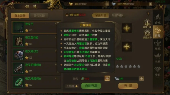 绑银或银子:升星失败时,玩家需要消耗绑银或银子来补偿损失。绑银可以通过游戏内的任务和活动获得,银子则可以通过充值获得。