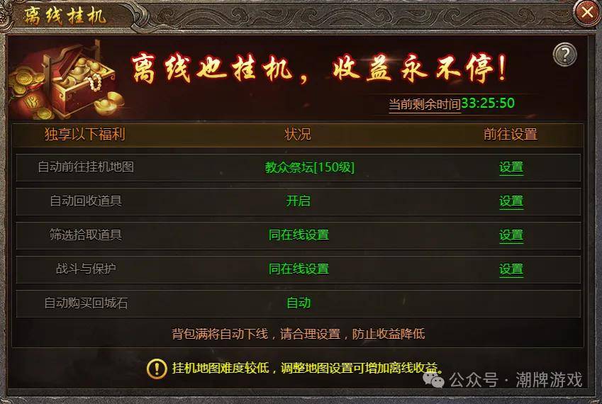 **小贴士**:在离线前确保挂机参数设置正确,避免因设置不当导致挂机效率低下。